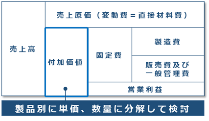 ①の「付加価値を増やす」は、製品別に単価、数量に分解して検討します。