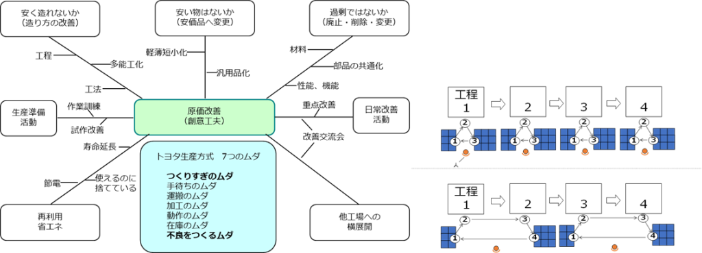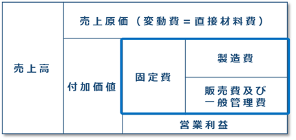製造の現場(直接部門と間接部門)では、「余力を生み出し、固定費を増やさないで売上(付加価値)増に対応」を目指して改善活動を推進します。