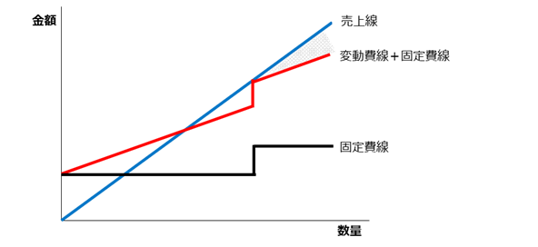 固定費線は、売上数量増により階段状に増えます。
