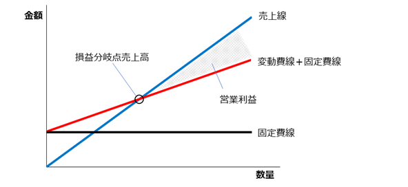 売上線と変動費線+固定費線が交わったところが損益分岐点売上高、売上線と変動費線+固定費線の間が営業利益です。
