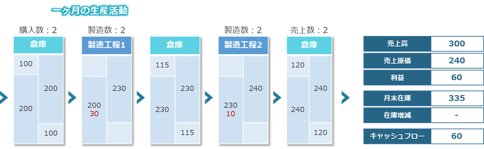 下記は、ある会社のひと月の生産活動のお金の流れです。