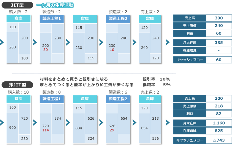 一方、非JIT型の生産の在庫保有日数は、月末在庫(1,160)÷売上原価(218)=5.3か月です。
